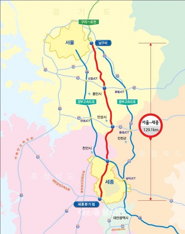 서울~세종고속도로는 경기 구리~안성~세종 129㎞ 구간을 잇는 왕복 6차선으로 2022년까지 서울∼안성 구간(71㎞)을 1차 완공하고, 나머지 안성∼세종구간 58㎞를 2025년까지 개통할 계획이다.