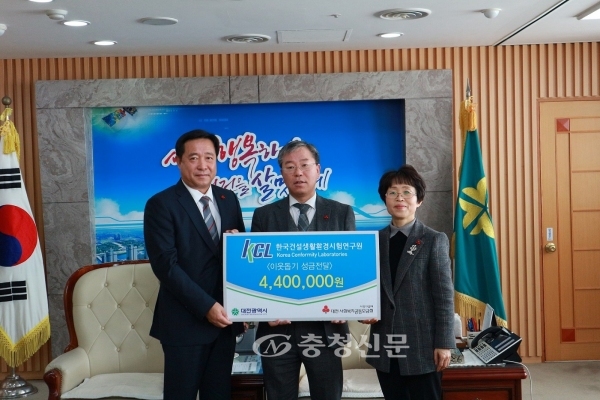 [충청신문=대전] 정완영 기자 = 21일 박경수 한국건설생활환경시험연구원(KCL) 박경수 충청사업본부장(사진 왼쪽)이 김택수 정무부시장(가운데)에게 시청 10층 응접실에서 동절기 취약계층 지원을 위한 성금 440만원을 기탁하고 있다.
