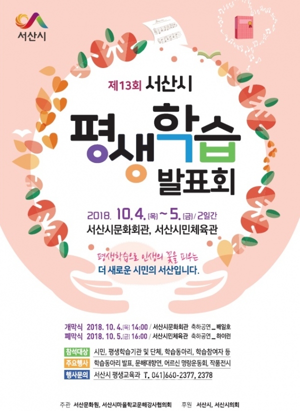 발표회 첫날인 4일에는 오후 2시부터 서산문화회관 대공연장에서 개막식이 진행되며 초청가수 축하공연과 관내 평생학습 동아리들의 악기연주, 댄스, 무용 등 평생학습동아리 발표회가 개최된다.