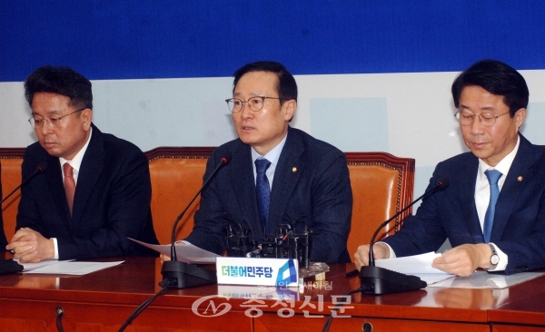 [충청신문=서울] 최병준 기자 = 12일 국회 더불어민주당 원내대표실에서 열린 원내대책회의에서 홍영표 원내대표가 "5·18 모독 망언에 대한 자유한국당의 태도가 전혀 변하지 않고 있다"며 "5·18 광주 민주화운동 망언을 한 의원들의 출당 등 응분의 조치로 결자해지하길 바란다"고 촉구했다.