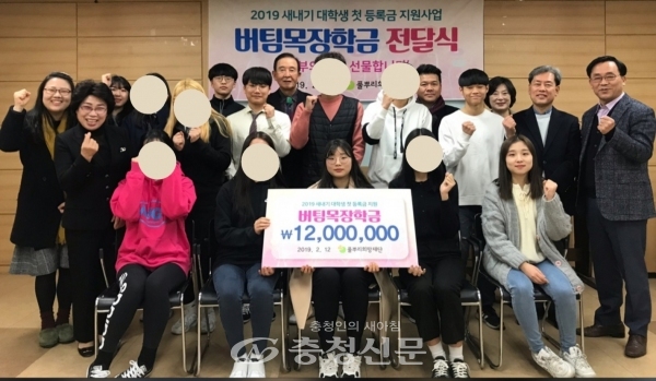 [충청신문=천안] 장선화 기자 = (재)풀뿌리희망재단(이사장 정선용)은 지난 12일 2019년도 대학입학을 앞둔 저소득가정 청소년 12명에게 버팀목장학금 1200만원을 전달했다.