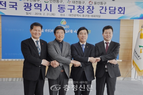 [충청신문=대전] 정완영 기자 = 대전 동구는 21일 부산·인천·대전·울산 4개 광역시 동구청장 간담회를 개최해 도시형성의 중심인 동구의 발전방안을 모색했다. 사진은 왼쪽부터 최형욱 부산 동구청장, 허인환 인천 동구청장, 황인호 대전 동구청장, 정천석 울산 동구청장이 서로 손을 잡고 힘을 모을 것을 다짐하고 있다.<사진=정완영 기자>