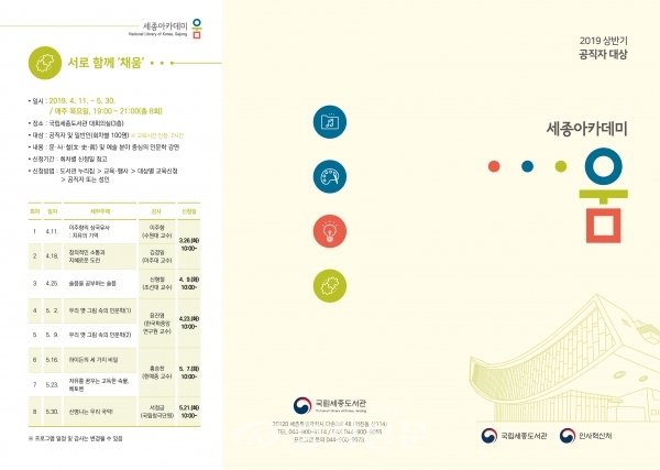 [충청신문=세종] 임규모 기자 = 국립세종도서관(관장 이신호)이 인사혁신처(처장 황서종)와 함께 공직자 대상 세종아카데미 '움'을 내달 9일부터 6월 14일까지 운영한다.