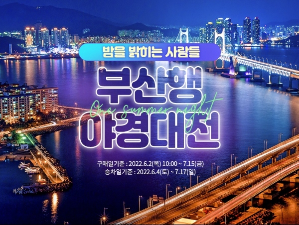 부산행 야경대전은 오는 7월 17일까지로, KTX 운임 최대 60% 할인과 부산 주요 야경관광지를 결합한 총 12개 상품으로 구성됐다. 여행 목적과 취향에 따라 자유여행과 패키지여행을 선택 구매할 수 있다.