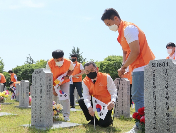 이날 임직원들은 현충탑 참배와 국립대전현충원과 자매결연을 맺은 장병 제3묘역 묘비 닦기, 태극기 교체작업 등 주변 정화활동을 진행했다.