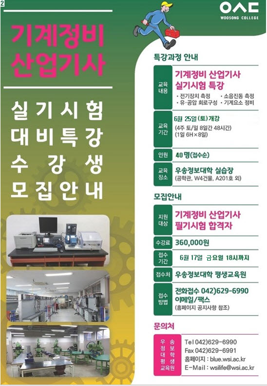 평생교육원 관계자는 "우송정보대는 지난 2020년 산업인력공단으로부터 기계정비 산업기사 실기시험장 인증을 완료하고, ONE-STOP 서비스 제공 시스템을 구축했다"고 말했다.