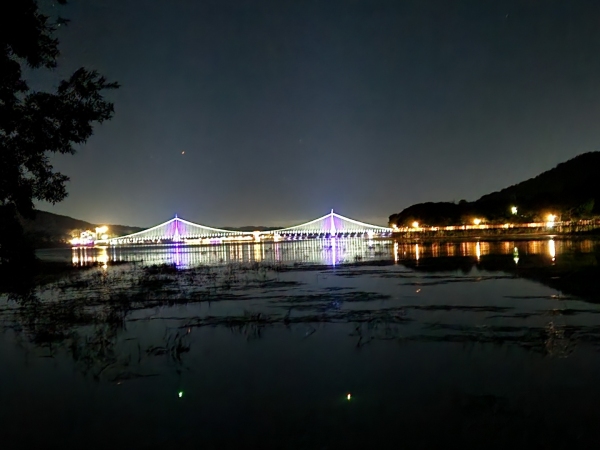 [충청신문=대전] 노경래 기자 = 지난 25일 충남 논산시 탑정호 출렁다리 조명이 가을밤을 화려하게 수놓고 있다. 이 다리의 규모는 길이 600m, 폭 2.2m로 논산시 가야곡면 종연리와 부적면 신교리를 연결하고 있다. (사진=노경래 기자)