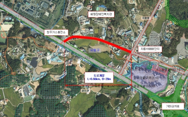 이번 공사는 공사비 30억원, 보상비 55억원등 총사업비 85억원을 들여 서원구 미평동에서 남이면 가마리까지 도로(총연장 0.66km, 폭 20m)를 개설하는 사업이다.