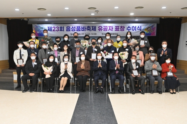 제23회 음성품바축제 적극참여지원 유공에 △음성읍 주민자치위원회 손연희 △금왕읍 지역발전협의회 정용대 △소이면 주민자치위원회 이진우 △원남면 주민자치위원회 유자열 △맹동면 덕금로 최일권 △대소면 주민자치위원회 유순익 △삼성면 이장협의회 박영근 △생극면 체육회 한경수 △감곡면 주민자치위원회 박희진씨가 수상했다.