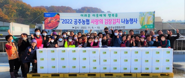 정종업 공주농협 조합장은 “해마다 연례행사로 공주농협이 자체적으로 주축이 돼 김장나눔을 하고 있다”면서 “우리지역에서 출하된 농산물로 김장을 담가 농사를 짓는 농업인들도 돕고, 가정형편이 어려운 이웃들이 건강하게 겨울을 나는데 작은 도움이라도 될 수 있도록 하는 차원에서 마련했다”고 말했다.