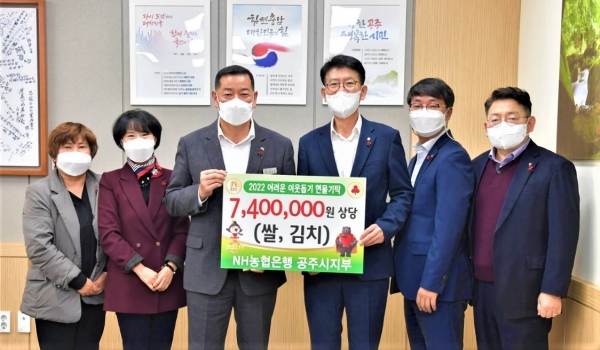 NH농협 공주시지부는 쌀가격 하락으로 어려운 쌀재배 농가를 위해 올해만 백미 1600만원 상당을 기부했으며, 지난 11일에는 농업인의 날을 맞이하여 공주쌀로 만든 떡으로 공주시민들에게 떡 나눔행사를 진행했다.