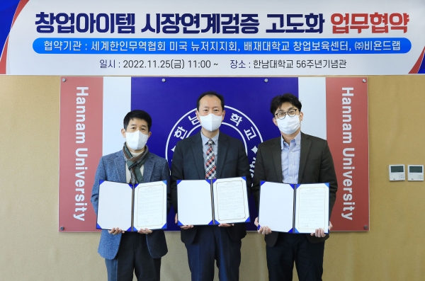 28일 한남대에 따르면 산학협력단 이노폴리스캠퍼스사업단은 세계한인무역협회 미국 뉴저지지회, 배재대학교 창업보육센터, 비욘드랩과 업무협약을 체결했다.