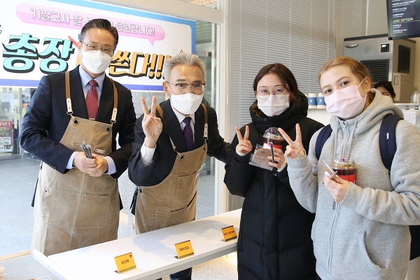 이희학 총장과 김영현 교학부총장, 보직자 등은 구내식당에서 학생들에게 배식을 지원했고, 커피숍에서 음료와 간식을 나눠주며 학생들을 응원했다.