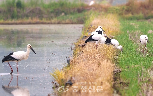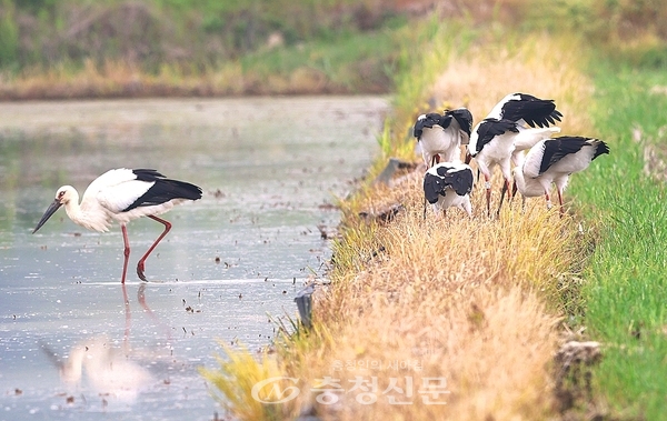 [충청신문=서산] 이승규 기자= 충남 천수만 일대에서 황새 가족의 나들이 모습이 카메라에 포착됐다.