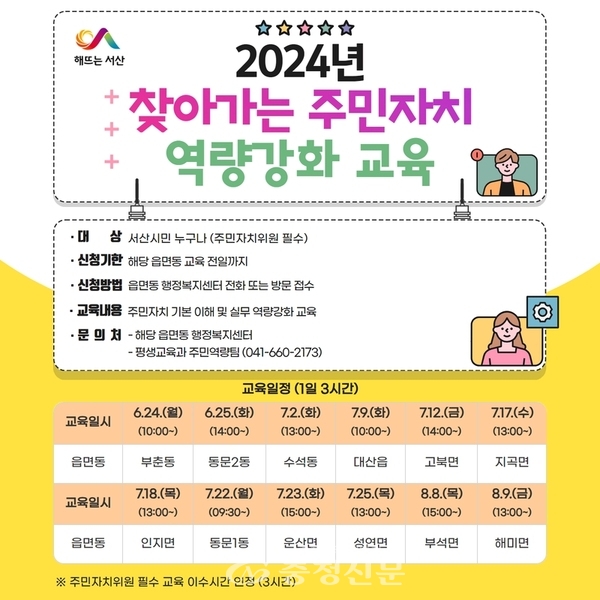 교육 일정 등 자세한 사항은 서산시 평생교육과(☎041-660-2173)와 해당 읍면동 행정복지센터에 문의하면 된다.