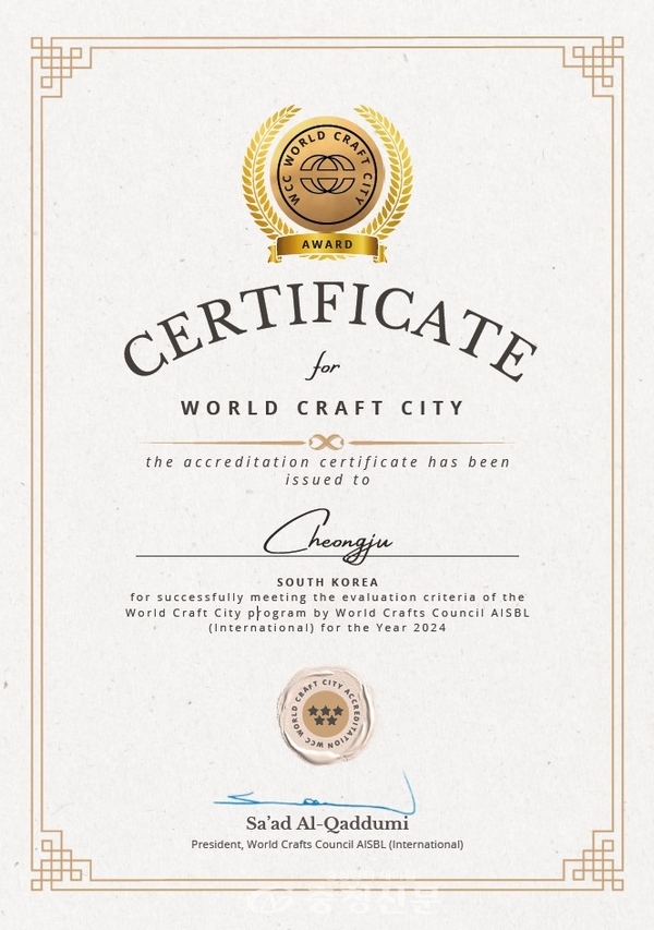 청주시와 청주시문화산업진흥재단(대표이사 변광섭, 이하 청주문화재단)은 17일, 세계공예협회(World Crafts Council, 이하 WCC)로부터 ‘세계공예도시’ 인증을 받았다고 공식 발표했다.