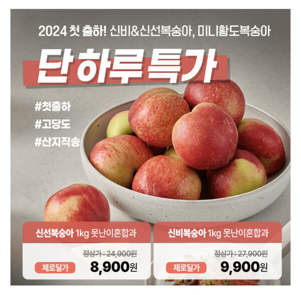 첫출하! 신비&신선복숭아, 미니황도복숭아 1kg가 소비자가24,900원 특가 OOOO원 무료배송 64% 할인으로 진행됩니다. 빈 칸에 들어갈 숫자는 무엇일까요?