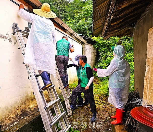 아울러 회원 10여 명과 행정복지센터 직원 등은 주택 벽면 빗물 누수를 확인하고 방지용 비닐을 설치한 후 가재도구 등을 정리했다.
