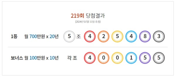 지난 11일 추첨한 219회 1등 당첨결과는 '5조 425483'번이 뽑혔다. 이번 회차 행운의 주인공은 1명에게 돌아갔다.