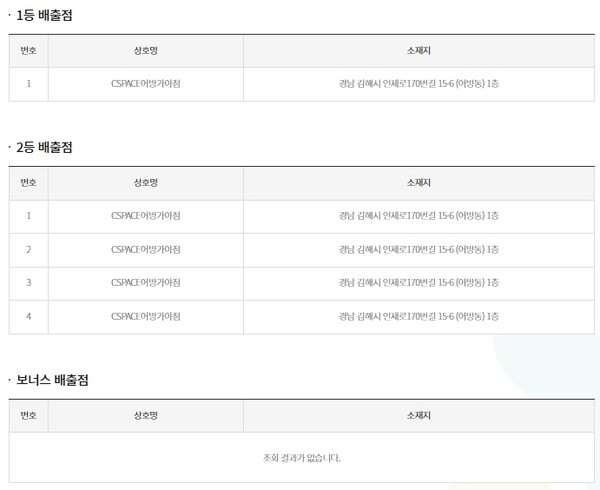 이번 회차에서는 눈길을 끄는 점은 1등과 2등 배출점이 경남 김해시 인제로 170번 길 15-6 (어방동) 1층에 위치한 'CSPACE 어방가야점'인 것으로 보아 1,2등 동시 당첨된 가능성이 높다.