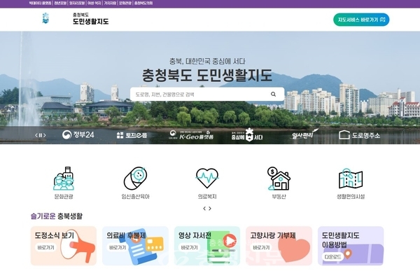 충북도 도민생활지도는 기존 주소, 문서 등 목록화 형태로 제공되고 있던 각종 행정정보를 시각화해 한눈에 쉽게 볼 수 있게 한 디지털 지도로, 지난 2022년부터 레이크파크 드론영상, 의료비후불제 참여기관 등 22여 종의 생활 정보를 시각화한 지도 서비스를 제공하고 있다.