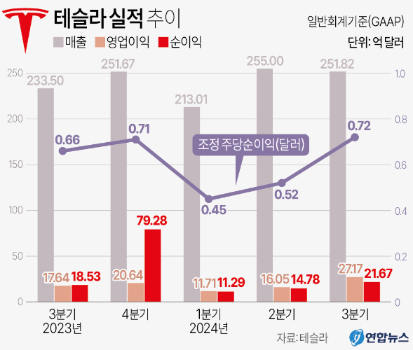 23일(현지시간) 테슬라는 3분기 매출이 251억 8000만 달러로 집계됐다고 밝혔다. 앞서 블룸버그통신이 집계한 전문가 예상치 254억 달러에는 못 미친 수준이나, 테슬라가 2분기에 기록했던 250억 5000만 달러와 1년 전의 234억 달러에서는 모두 늘어난 수치다.