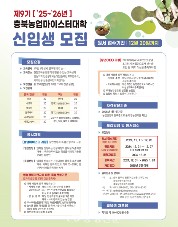 그 밖의 입학 관련 자세한 사항은 충북농업마이스터대학 홈페이지와 입학 안내 참조 또는 해당 품목 캠퍼스와 대학 본부로 문의하면 된다.