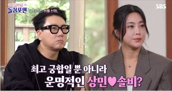 1:1 데이트 커플 선정 시간에서는 사주 궁합 점수라는 신선한 방식이 진행됐다. 최고 점수를 기록한 90점의 커플은 이상민과 솔비였다. 이 점수에 솔비는 “90점이면 엄청 잘 맞는 거 아니냐”며 설레는 표정을 지었다.