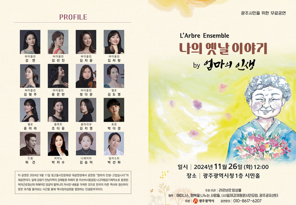 오는 26일 낮 12시, 광주광역시청 1층 시민홀에서 라르브르 앙상블의 인생음악극 ‘나의 옛날 이야기 BY 엄마의 인생’이 관객들을 만난다. 역사적 아픔과 개인의 기억을 음악과 예술로 풀어낸 이번 공연은 단순히 듣는 즐거움을 넘어 깊은 공감을 선사할 예정이다.
