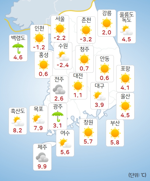 주요 지역 아침 최저 기온은 서울 -4도, 인천 1도, 수원 -1도, 춘천 -3도, 강릉 1도, 청주 2도, 대전 0도, 전주 3도, 광주 3도, 대구 0도, 부산 4도, 제주 8도다.