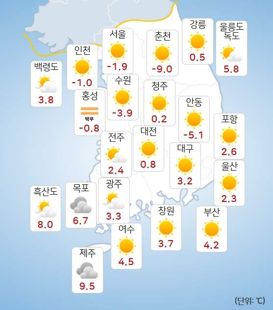 주요 도시 예상 최저기온은 △서울 -2도 △인천 0도 △춘천 -6도 △강릉 1도 △대전 -1도 △대구 0도 △전주 2도 △광주 2도 △부산 3도 △제주 8도다.