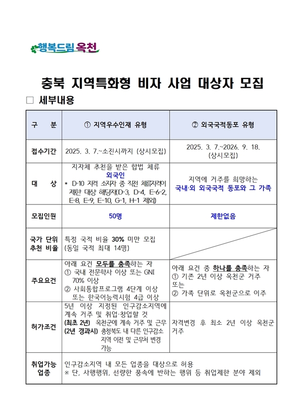 지역특화형 외국국적동포(F-4-R) 비자는 모집인원에 제한이 없으며 옥천군에 2년 이상 거주한 외국국적동포 이거나 가족과 함께 옥천군으로 동반 이주하려는 60세 미만의 외국국적동포면 신청할 수 있다. 해당 사업으로 비자를 얻게 되면 재외동포(F-4) 비자보다 취업 범위가 확대돼 단순 노무까지 취업가능하다.