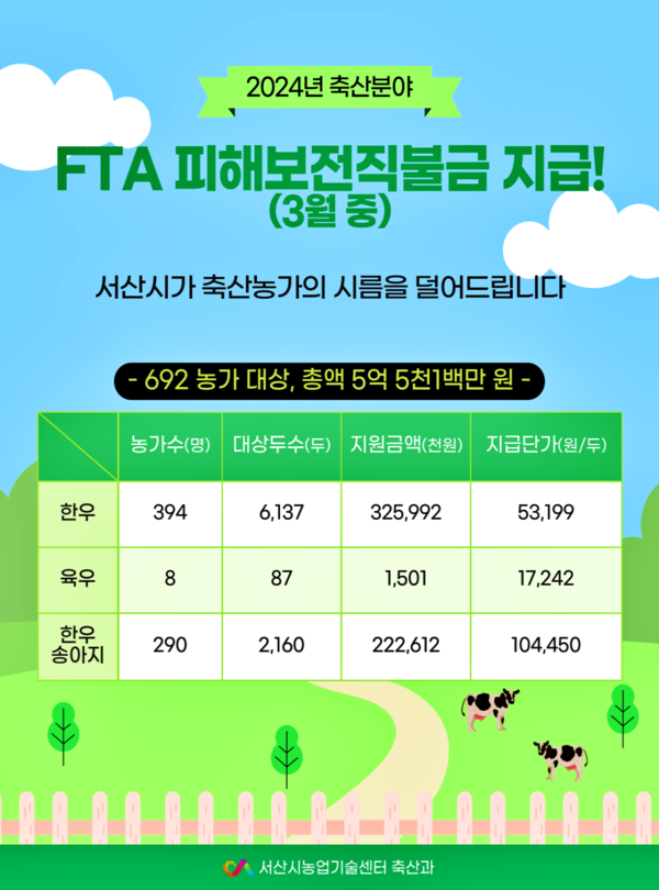 서산시 차선준 축산과장은 “앞으로도 사룟값 상승과 축산물 가격 하락으로 어려움을 겪는 관내 소 사육 농가의 경영 안정과 경쟁력을 강화할 수 있도록 시에서도 지속해서 노력하겠다”고 밝혔다.