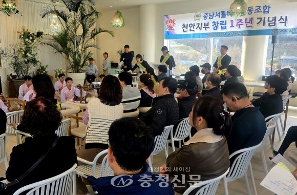 [충청신문=천안] 장서화 기자 = 충남셔틀버스협동조합 천안지부(지부장 임민수)가 창립 1주년을 맞아 6일 천안시 동남구 카페루에서 기념식을 개최했다.