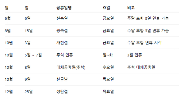 ◆ 2025년 남은 공휴일 및 대체공휴일 일정