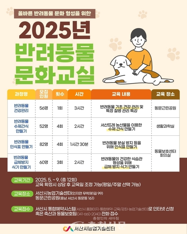 반려동물 건강관리 교육 외 나머지 프로그램은 서산시 농업기술센터 일원에서 진행하며, 각 프로그램에 대한 교육 신청은 서산시 통합예약시스템 온라인 또는 서산시 축산과(☎041-660-2040)로 전화로 예약하면 된다.