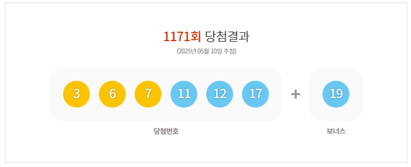 로또복권 운영사 동행복권은 제1171회 로또복권 추첨에서 ‘3, 6, 7, 11, 12, 17’이 1등 당첨번호로 뽑혔다고 10일 밝혔다.