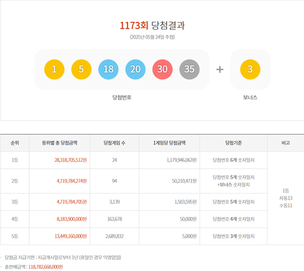 로또복권 운영사 동행복권은 제1173회 로또복권 추첨에서 ‘1·5·18·20·30·35’가 1등 당첨번호로 뽑혔다고 24일 밝혔다. 2등 보너스 번호는 ‘3’이다.