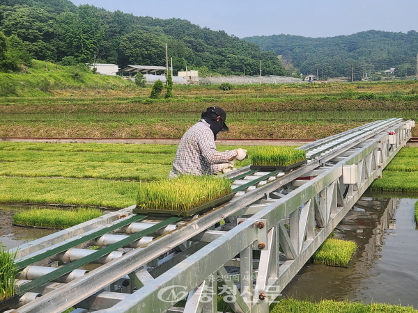 개당 약 3~5kg인 모판을 수천 개씩 나르는 작업을 자동화함으로써 노동 강도는 절반으로 줄었다.