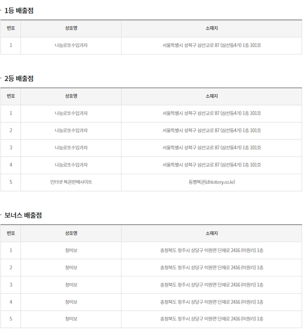 이어 보너스 당첨은 충청북도 청주시 상당구 미원면 단재로 2416 (미원리) 1층에 위치한 청미보 복권판매점에서 5매 배출됐다.