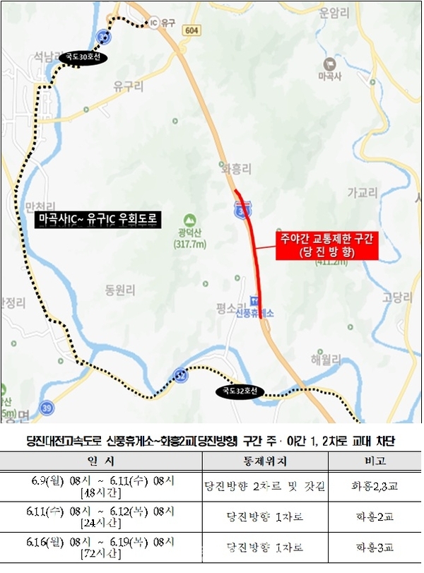 5일 한국도로공사에 따르면 9일 오전 8시부터 12일 오전 8시까지 신풍(당진방향)휴게소에서 화흥2교까지 1.8㎞구간을, 16일 오전 8시부터 19일 오전 8시까지는 신풍(당진방향)휴게소에서 화흥3교까지 0.9㎞ 구간 1, 2차로를 주‧야간 교대로 차단할 예정이다.