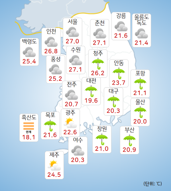 낮 최고기온은 ▲서울 25도 ▲인천 23도 ▲춘천 25도 ▲강릉 25도 ▲대전 24도 ▲대구 28도 ▲부산 26도 ▲전주 25도 ▲광주 26도 ▲제주 28도다.