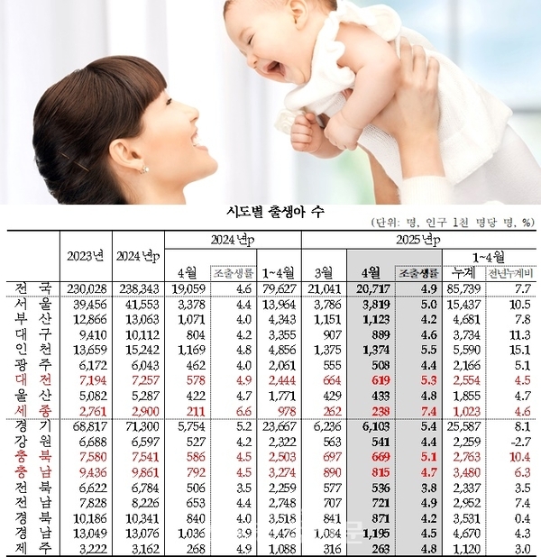 1~4월 누계 출생아 수는 대전(2444명→2554명) 4.5%, 세종(978명→1023명) 4.6%, 충남(3274명→3480명) 6.3%, 충북(2503명→2763명) 10.4% 늘었다.