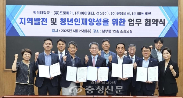 이번 협약은 조기취업형 계약학과 운영, 채용 연계, 현장실습, 공동 교육과정 개발, 산학연계 프로그램 추진 등을 주요 골자로 한다. 협약식에는 각 기업 대표 및 임원, 백석대 이경직 기획산학부총장, 김혜경 지역혁신추진단장, 이근호 산학협력단장 등 주요 관계자들이 참석했다.