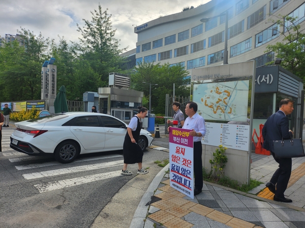 [충청신문=세종] 정완영 기자 = 2일 최민호 세종시장이 해양수산부 부산 이전에 반대하며 세종시 어진동 정부세종청사 해수부 정문 앞에서 이전의 부당성을 주장하는 1인 시위를 하고 있다. (사진=정완영 기자)