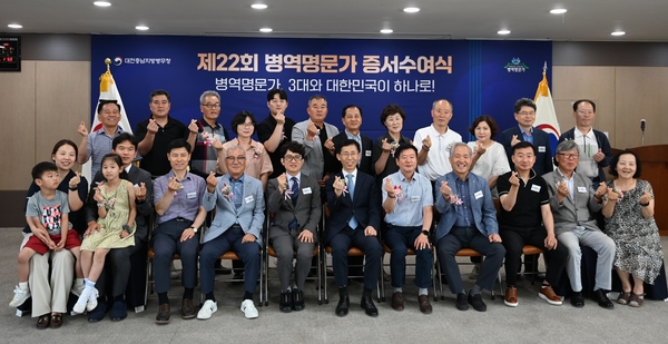 임준모 대전충남병무청장은 “대를 이어 나라사랑을 실천하신 병역명문가 분들께 깊은 존경과 감사를 드린다”며 “앞으로도 병역명문가 예우 확대와 실질적 혜택 제공을 위해 적극적인 정책을 펼쳐 나가겠다”고 밝혔다.