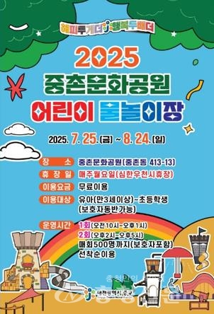 중촌문화공원 물놀이장은 에어풀장·워터슬라이드 등 다양한 놀이시설과 함께 휴게시설이 갖추고, 오전 10시부터 오후 5시까지 무료로 개방한다. 단 매주 월요일은 휴장한다.