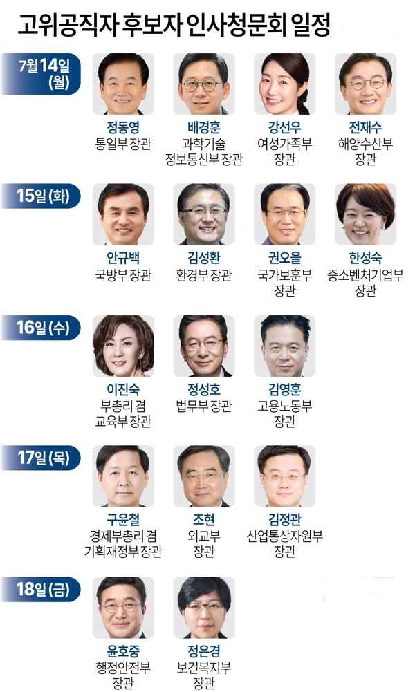 인사청문회 일정은 △14일-정동영(통일부), 배경훈(과학기술정보통신부), 강선우(여성가족부), 전재수(해양수산부) 후보를 시작으로 △15일-안규백(국방부), 김성환(환경부), 권오을(국가보훈부), 한성숙(중소벤처기업부) △16일-이진숙(사회부총리 겸 교육부), 정성호(법무부), 김영훈(고용노동부) 후보로 이어진다.