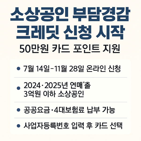 이 사업은 2024년 또는 2025년 연 매출 3억 원 이하 소상공인을 대상으로 하며, 전기·가스·수도요금과 국민연금·건강보험·고용보험·산재보험 납부에 사용할 수 있는 50만 원 상당의 크레딧(카드 포인트)을 지급한다.
