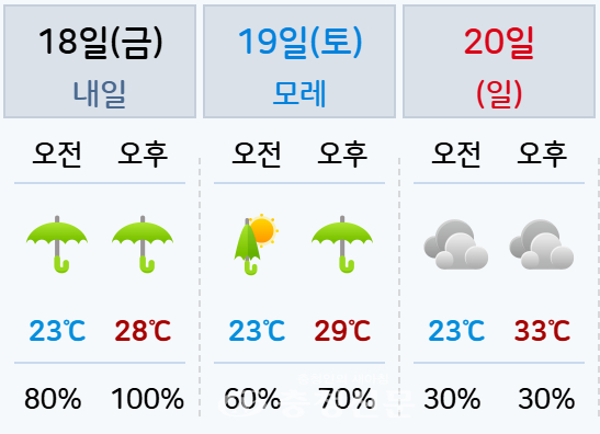 이어 19일도 대체로 흐리고 대전. 세종. 충남에 비가 내리겠고 지역에 따라 소강상태를 보이겠다. 아침 최저기온이 23~24도, 낮 최고기온 28~30도가 예상된다.